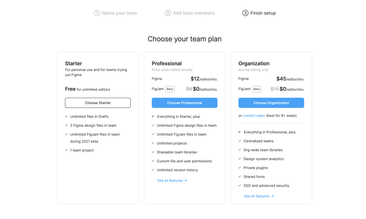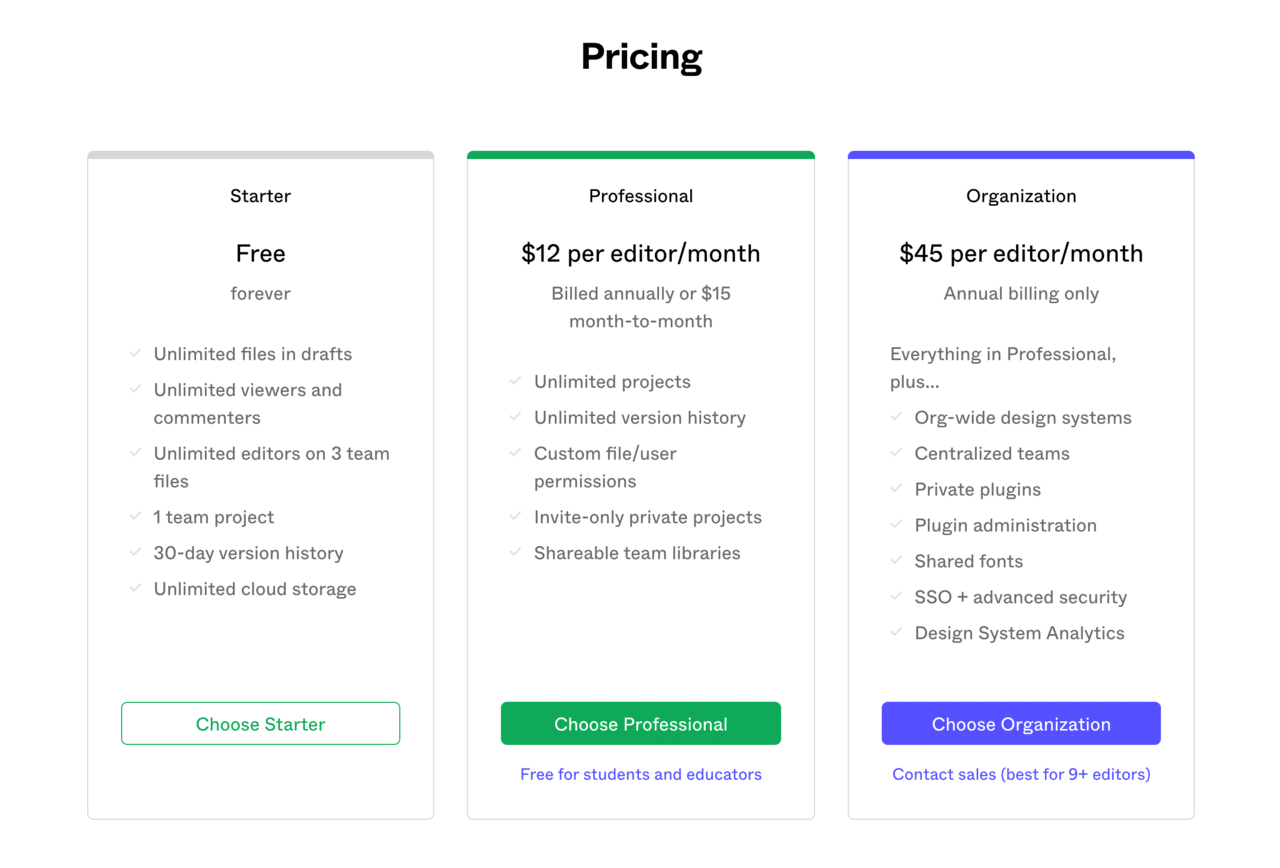 画像出典:Figma Pricing / ([https://www.figma.com/pricing/))」 プランには・Starter・Professional・Organizationの3つが用意されています。 Starterプランはアカウントさえ作成すれば無料で使用できます。Starterプランの使用範囲は以下になります。・下書き無制限・無制限の招待とコメント投稿・3つのデザインファイルと無制限エディター(デザイン操作できる人)・1チームにつき1プロジェクト・30日間のバージョン履歴・無制限のクラウドストレージ最近のアップデートで、上記のような使用範囲の制限に変わったのですが、以前までは、1チームにつき3プロジェクト、無制限でデザインファイルを作成できる代わりにエディターは2名までという制限がついてました。 無料プランで運用している弊社のデザインチームとしては、これが中々悩ましいアップデートで、、、デザインの運用方法を考え直さなければいけなくなっている現状です。