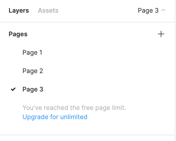少々ややこしいですが、Figmaのデザインファイルの中にページという概念が存在します。ページを分けることで、デザインの整理がしやすくなります。ただこちらも3ページまでです。以前までは、無限に作れたのに、、個人的にはこのページ制限が、無料プランの一番つらい制限です。