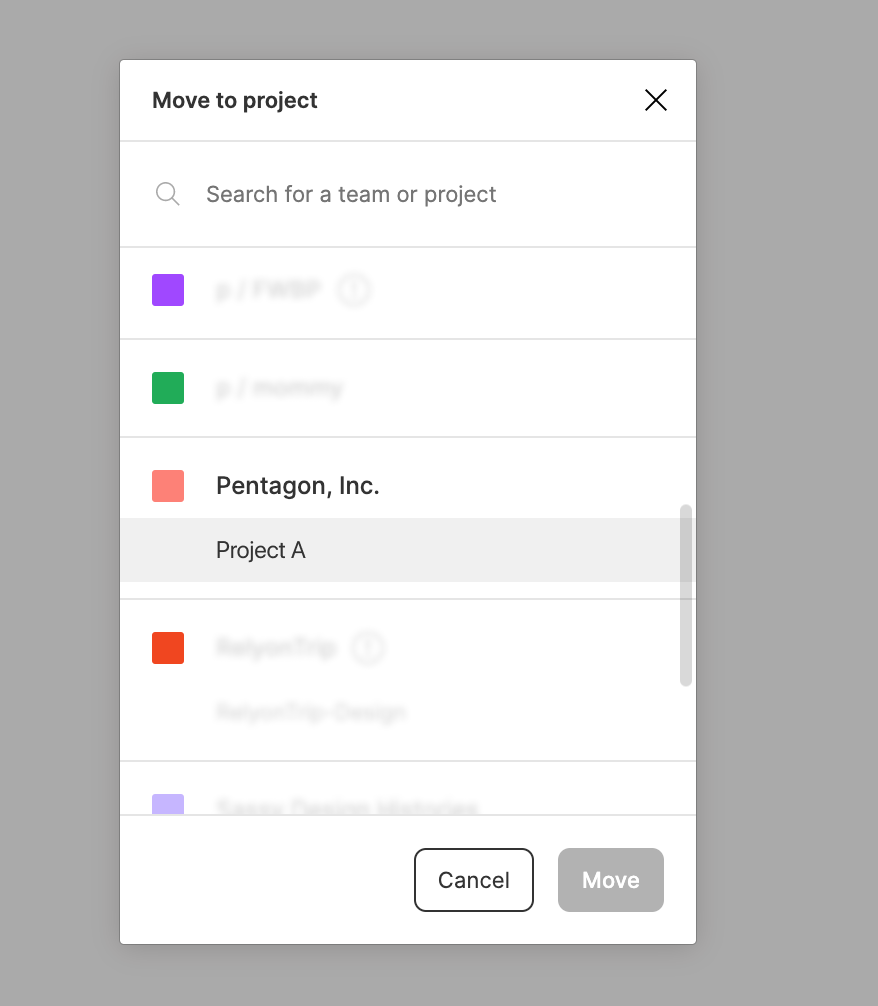 「Move to project…」選択後、移動先のプロジェクトが選択肢に出てこない場合があります。 この場合は、Figmaホーム画面に戻り、該当のプロジェクトに「★」マークをつけましょう。 そうすると、移動先のプロジェクトとして選択肢に出てくるようになります。