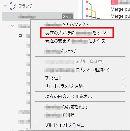 目的:ブランチAにブランチBをマージする ①ローカルでブランチAにチェックアウト(移動)しておく ②ブランチAにチェックアウトしている状態で、ブランチB(マージしたいブランチ)を右クリック ③「現在のブランチにブランチBをマージ」を選択