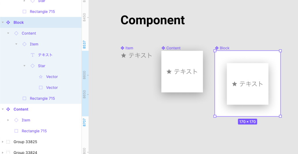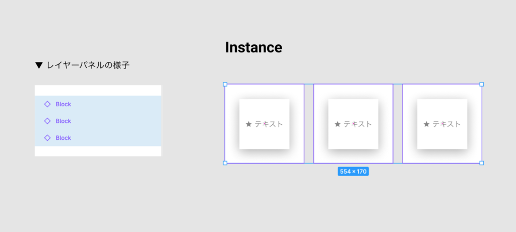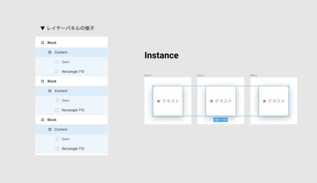Figma では「メインコンポーネント(Main Component)」と「インスタンス(Instance)」という概念があります。 「メインコンポーネント」からコピーした要素は「インスタンス」と呼ばれ、メインコンポーネントに設定したサイズ・色・シャドウなどの情報が引き継がれています。 また、メインコンポーネントで色やサイズなどを変更すると、インスタンスにもその変更内容が自動的に反映される仕組みです。