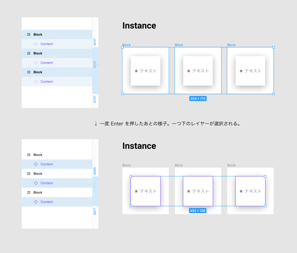 次に、下の階層のレイヤーに対しても同様に Detach instance の操作を行います。 すべてのレイヤーが選択されている状態のまま、Enter を1回 押しましょう。 すると、一つ下のレイヤーが選択された状態に変わります。