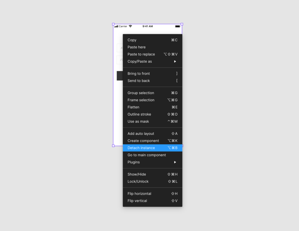 便利な機能である一方、現時点(2021/10/09時点)で Figma には「複数のインスタンスを解除する」機能がありません。 インスタンスを右クリックすると、「Detach instance」というメニューが出てきます。 この「Detach instance」は「インスタンスを解除する(メインコンポーネントとの紐付けを解除する)」ための機能です。 しかし、一つ一つ右クリックしてインスタンスを解除するのは大変です。