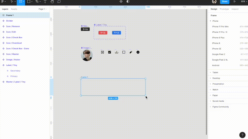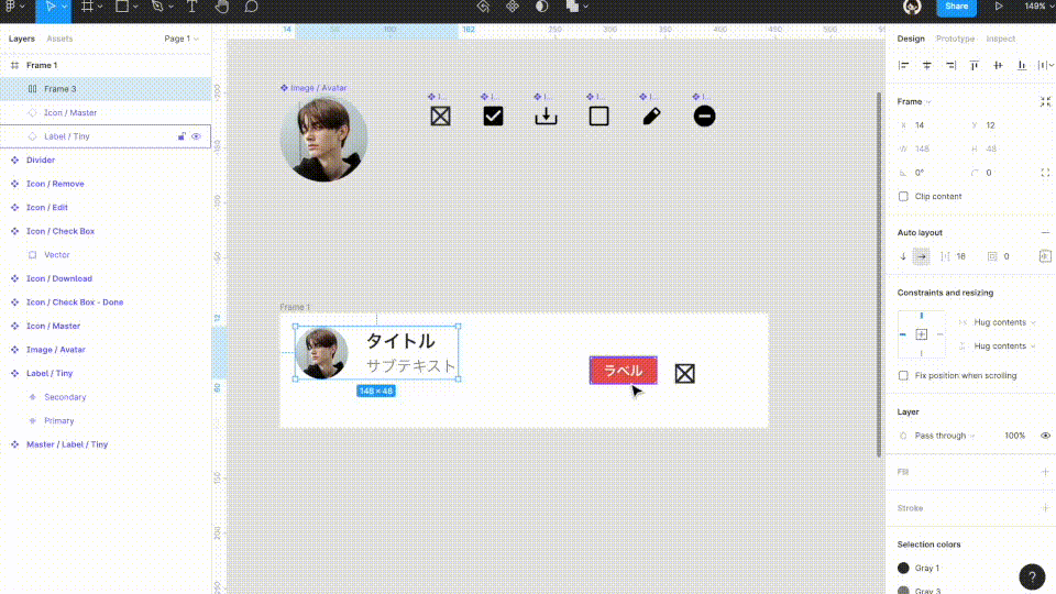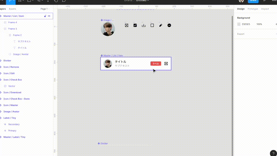 ・List / Item / w Label・List / Item / w Avatar・List / Item / w Avatar and Button 作り方はラベルのときと同じです。まずはベースコンポーネントとなる List / Item を作ります。このベースコンポーネントにはアバター画像、タイトル、ラベル、アイコン(ボタン用)など、リスト内で必要な部品をすべて詰めた状態で作成します。 そして、Variants で管理をするときに、それぞれ「そのリストの状態で必要なものだけ」表示することで、1つのベースコンポーネントに沿った、管理しやすいリストのコンポーネントを作ることができます。 では、まず左側をつくります。