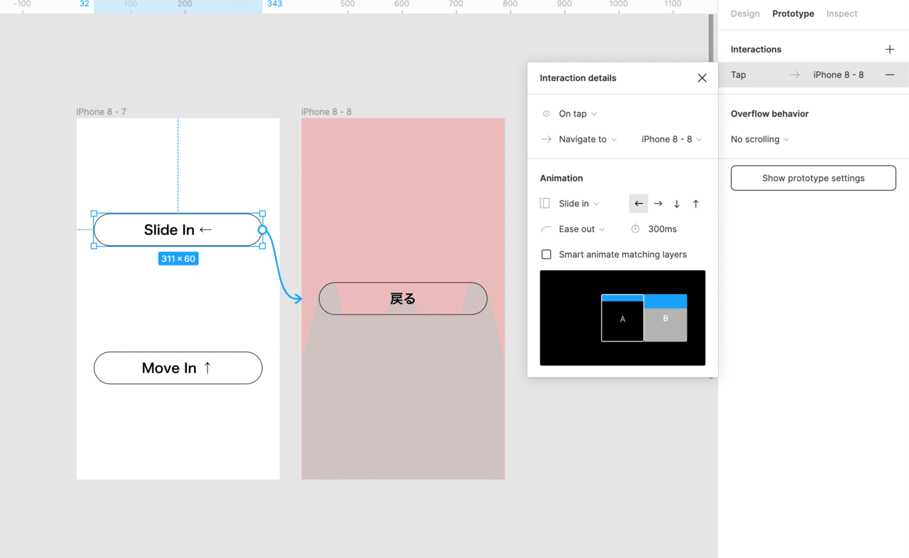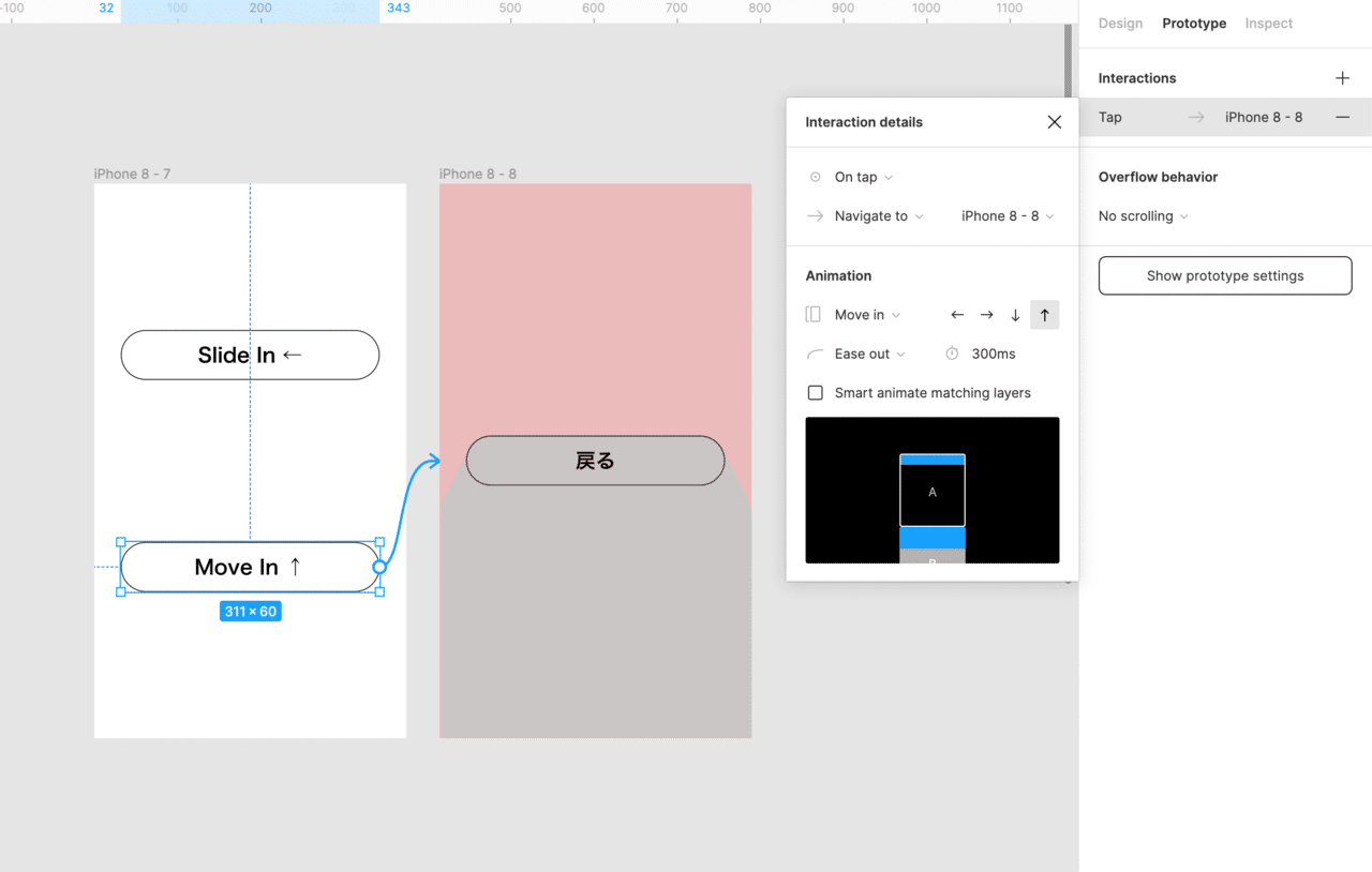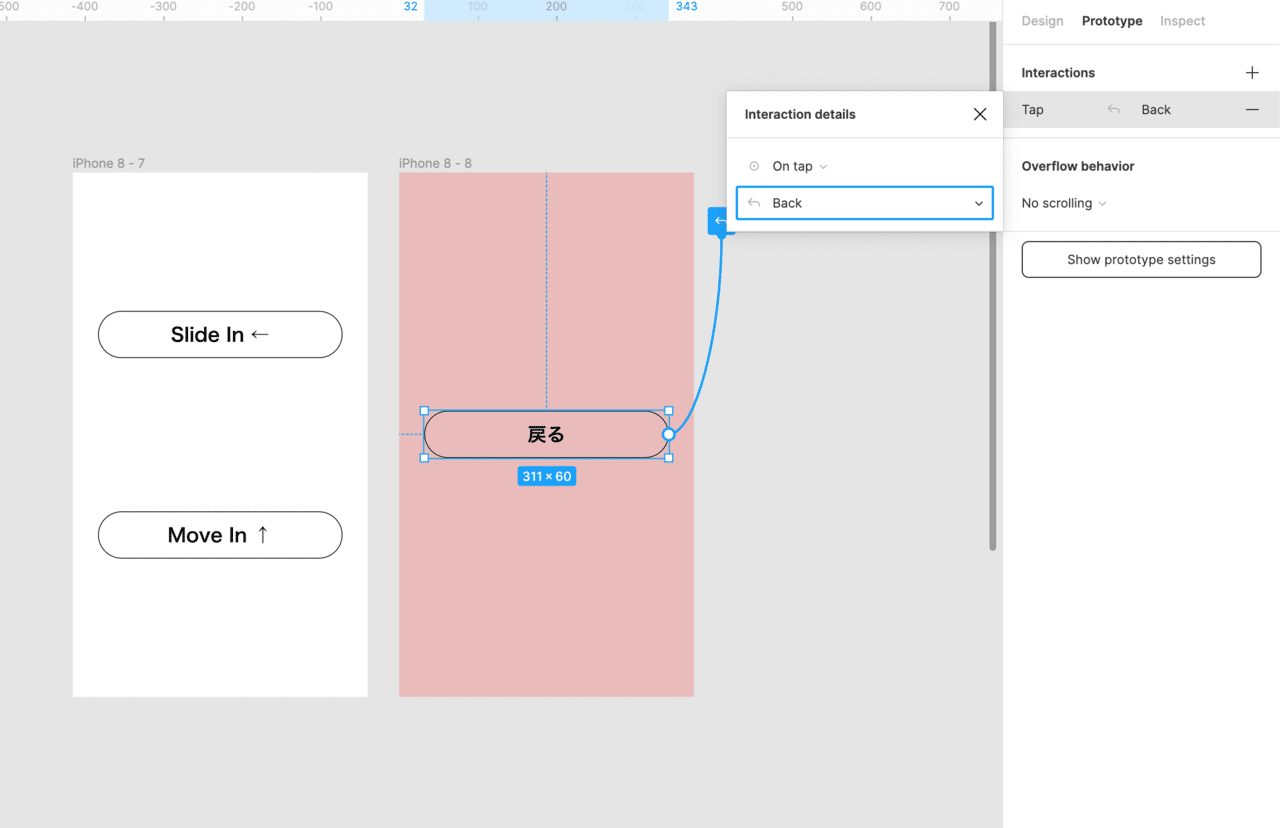 これは直前の画面に戻るだけでなく、直前の画面で設定したインタラクションの「方向」に対しても、逆方向の設定をした上で遷移してくれます。そのためインタラクションの詳細設定をする手間を省くことができます。インタラクション設定ミスが減るので、嬉しい機能です。