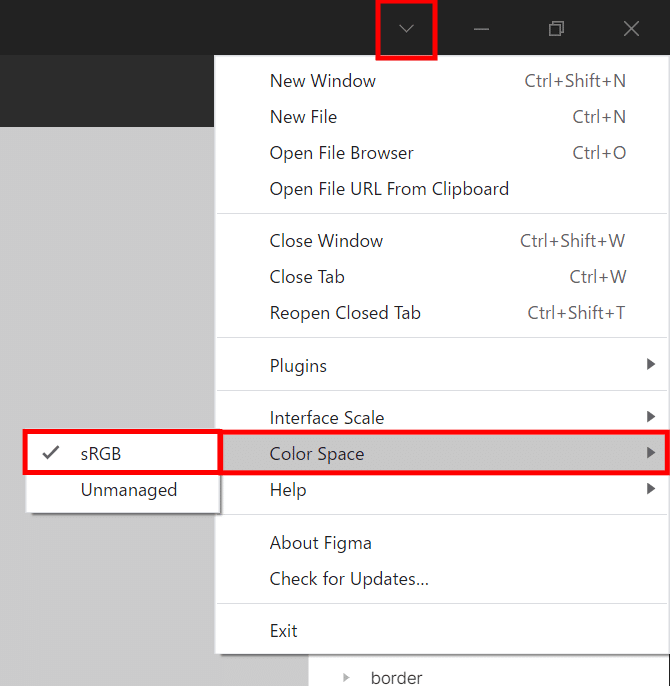 WindowsでFigmaアプリをお使いの場合、画面右上の「v」ボタン→「Color Space」→「sRGB」と設定します。