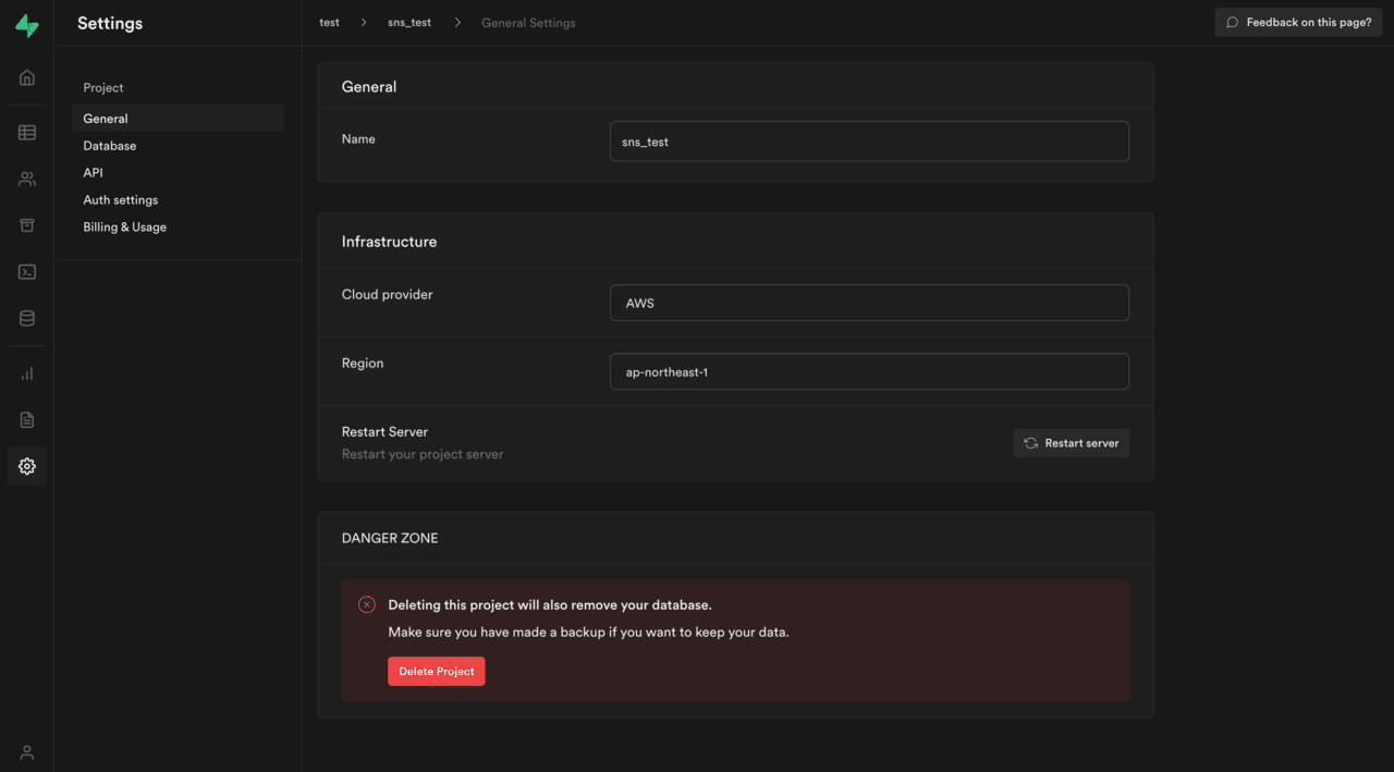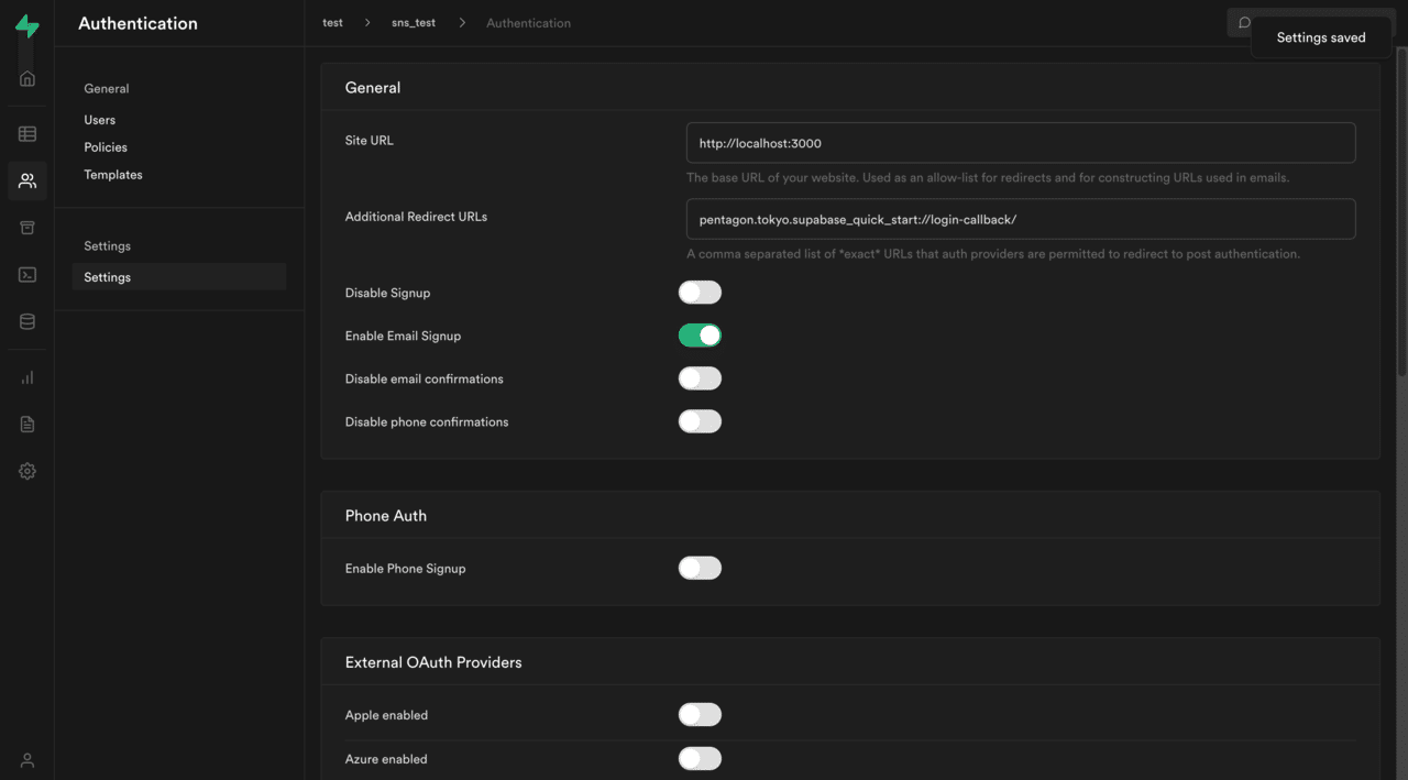 5.2. サイドバーのSettingへ移動5.3. Additional Redirect URLsに今回作成するFlutterプロジェクトのbundle identiferを利用したスキームURLを入力する、今回の場合、「tokyo.pentagon.supabase_quick_start://login-callback/」としました