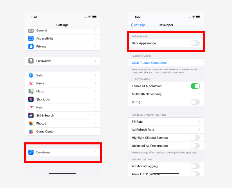 アプリ全体を常にライトモードにするには、Info.plistのUIUserInterfaceStyleパラメータをLightにします。これでアプリは、ダークモードに対応しないことになり、ダークモードの対応を回避できます。 次に、ダークモードの対応方法を見ていきましょう。