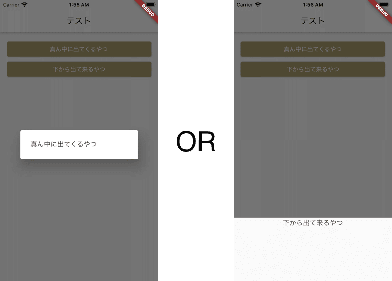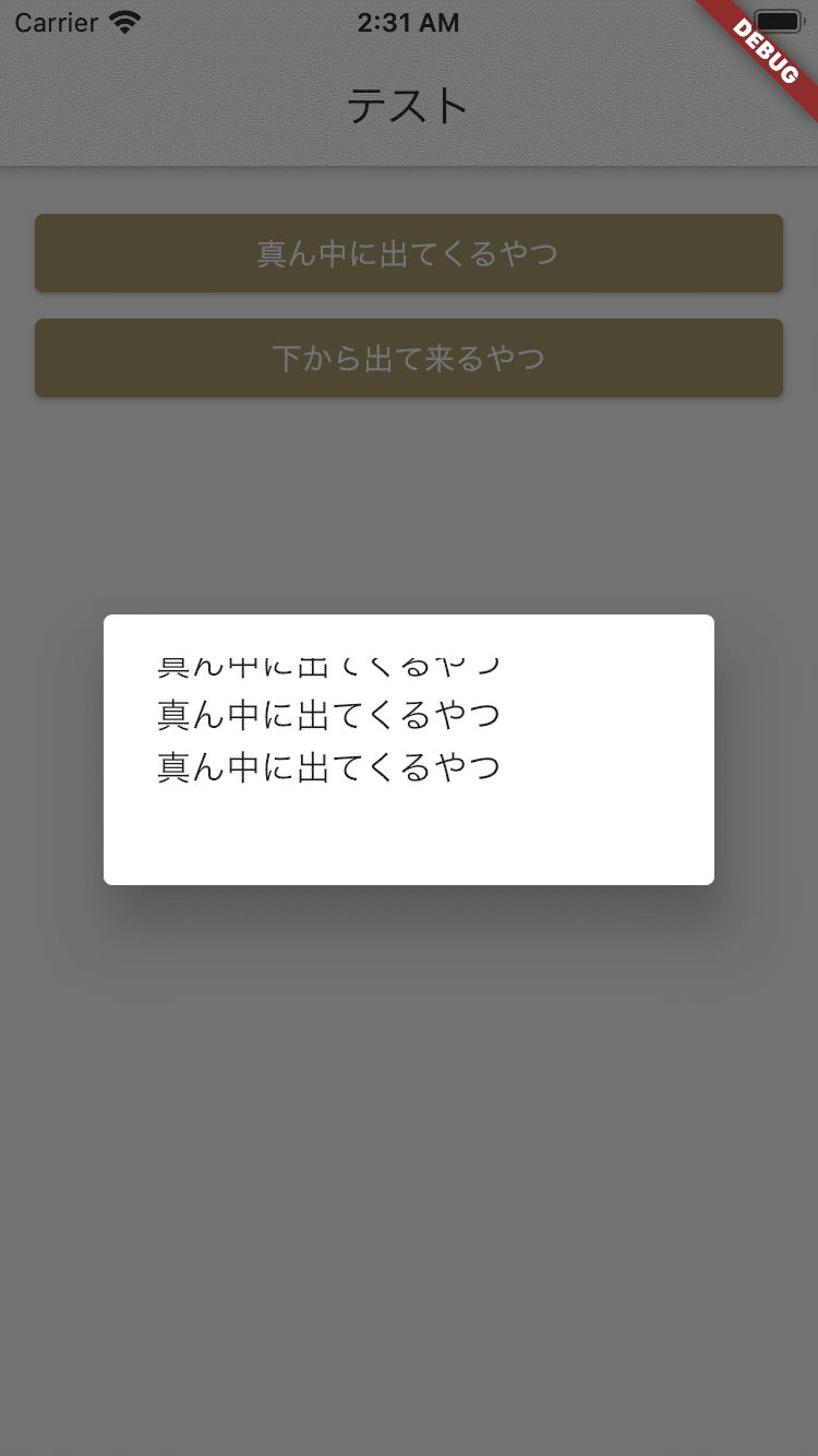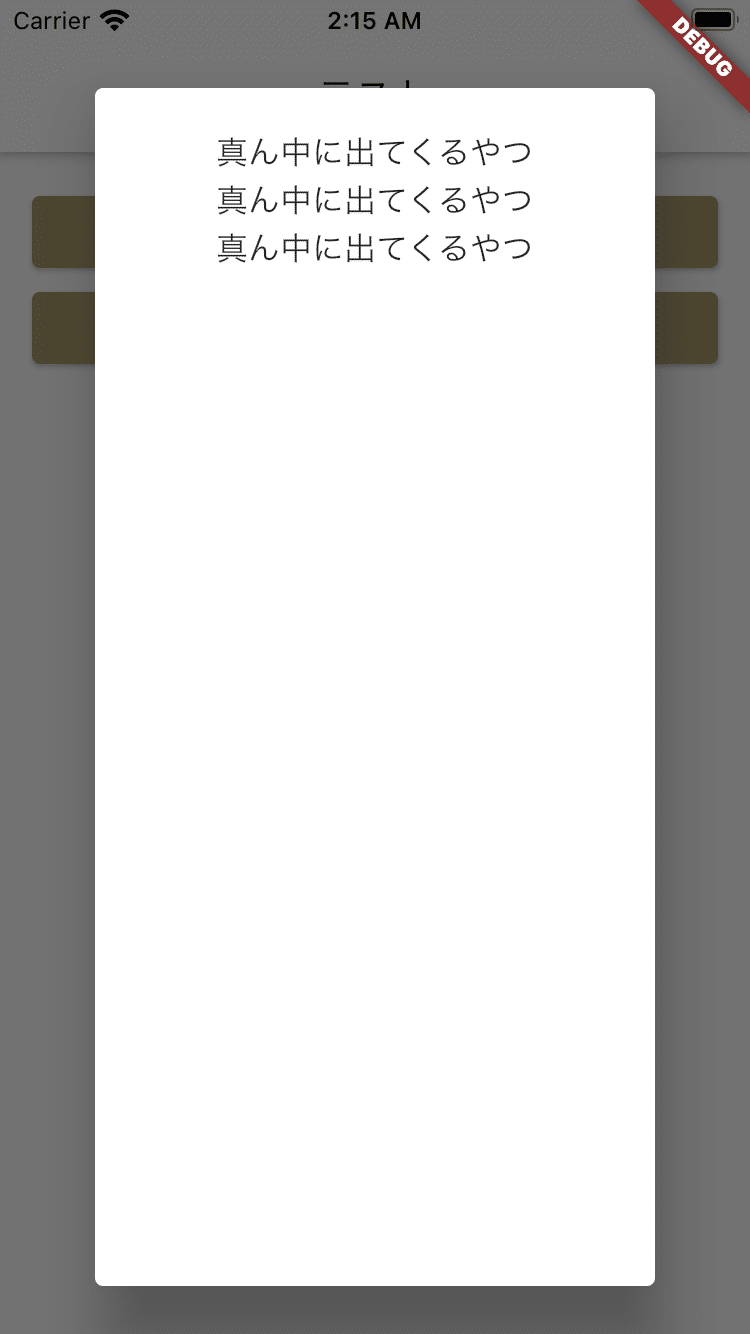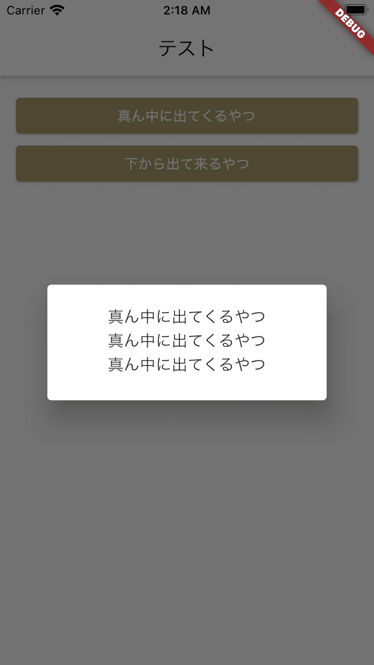 content: Text('真ん中に出てくるやつ'), // <= ここでダイアログに表示したいWidgetを返してあげればOK