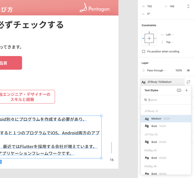 資料の中で使用するテキストスタイルは、なるべく統一することでより見やすくなります。 Pentagonの資料テンプレートでは、 ・本文のテキスト(通常/太字) ・見出しテキスト ・英字の見出しテキスト など用途ごとのスタイルをコンポーネントで作成してあります。 適したスタイルを選ぶだけで、行間・字間も統一された見やすい資料を作成することが可能です。