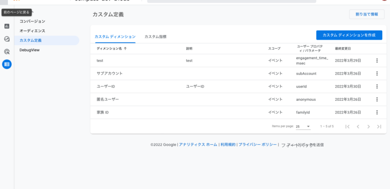 ここまででFlutterのスマホアプリからカスタムイベントの送信まで実装できたと思います。次にカスタムディメンションをGoogle Analyticsで設定する必要があります。