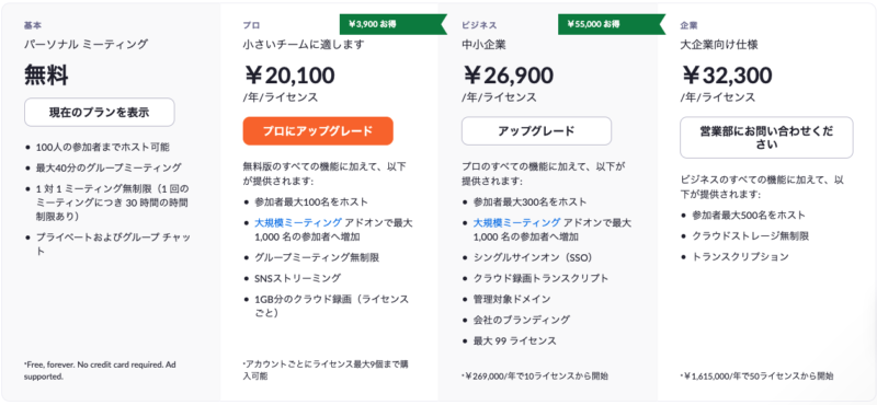 詳細は下記URLに記載がありますが、現時点でZoomの料金プランには4つあります。 https://zoom.us/pricing
