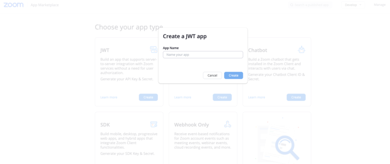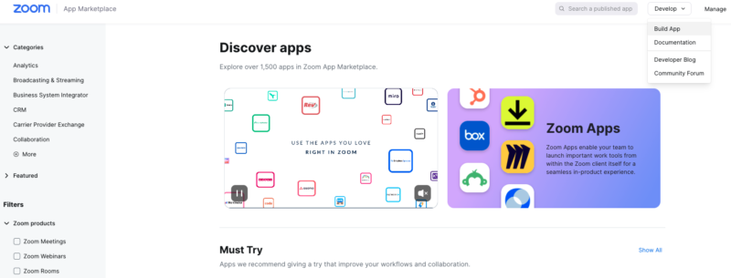 Zoom APIを利用するにはまず、Zoomのアカウントを取得します。 次に、下記URLでアカウントにログインし、右上のドロップダウンリストの「Develop > Build App」を選択してください。 https://marketplace.zoom.us/