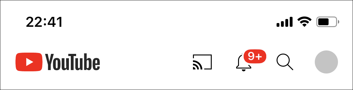 ロゴ、ローカルネットワーク、通知、検索、アカウントが表示されています。 YouTubeは動画再生アプリなので、検索やローカルネットワークなどの機能が置かれているのが分かります。