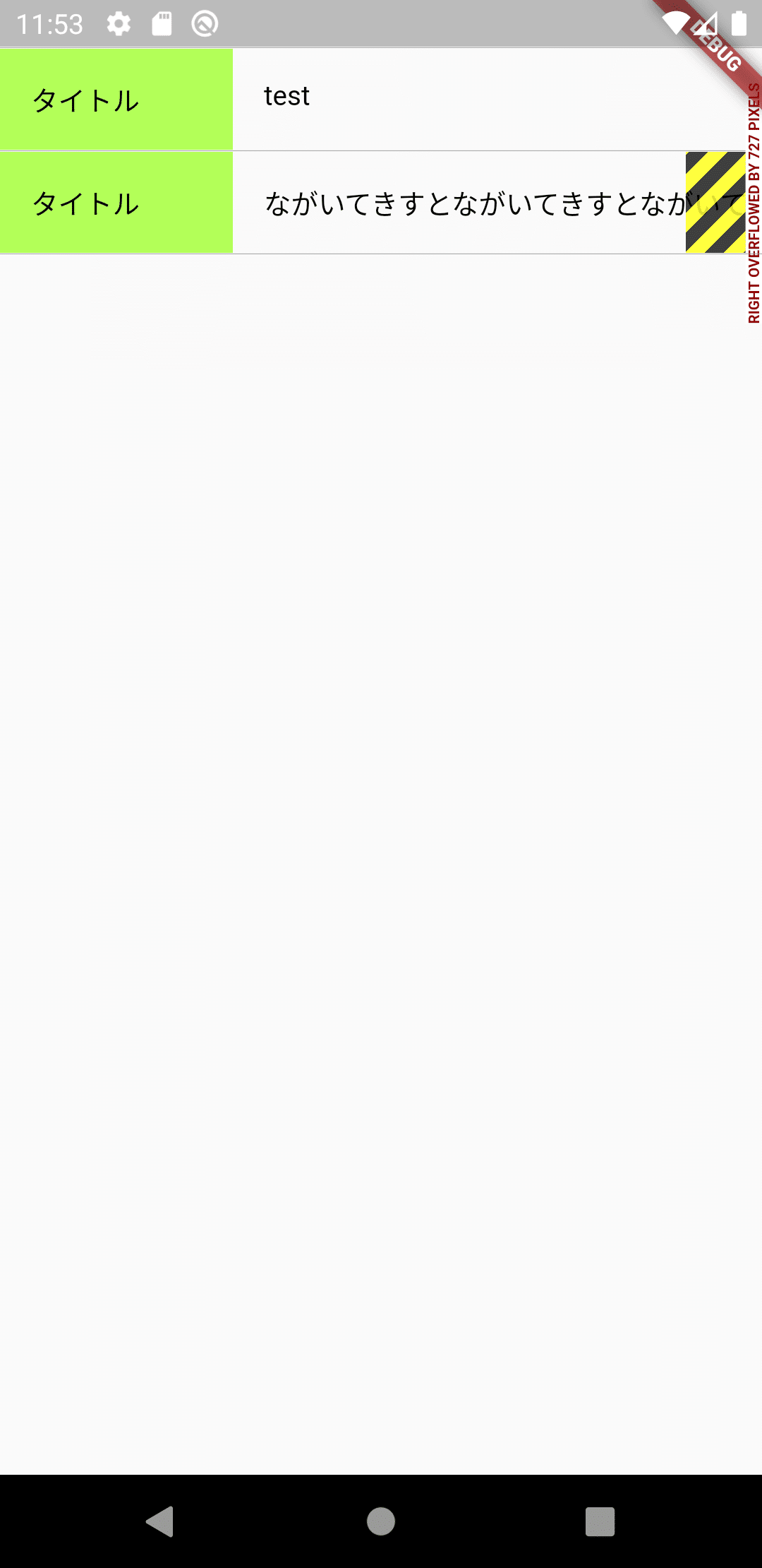 上記のコードだと、右側の要素がオーバーフローした場合に動的にサイズが変更できていないため、右側の要素の親であるContainerをExpandedで囲むことで動的に長さを変えてくれるようになりました。(ついでに不要なFlexibeを排除しました。)