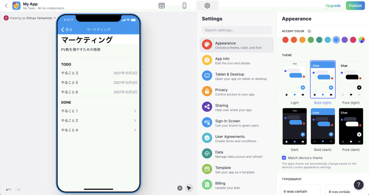 とこどころ動いてないけど、雰囲気を掴んでもらえればと。作ったアプリ:[)https://crabby-drawer-9589.glideapp.io/ カラーテーマで色をサクッと変えられるが、テキストの色など細かい部分は変更できないので、デザイナーとしては物足りない。