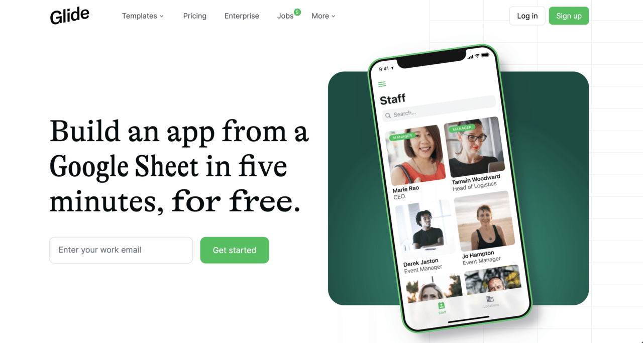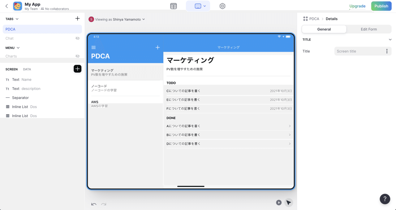 こんにちは、株式会社Pentagon代表の山本です。 https://pentagon.tokyo 当社では「アプリを駆使した事業を立ち上げたい」方のために、アプリの設計・デザイン・開発までまるっとサポートしています。 前回のnoteでノーコードのサービスについて調査しました。 難易度が、Glide < Adalo < Bubbleなので、とりあえずGlideを触ってみました。