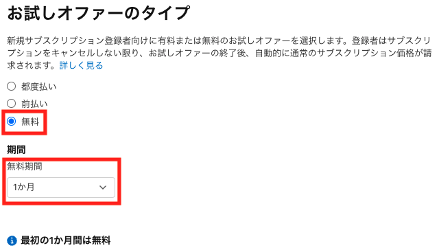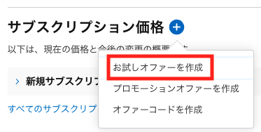 これでサブスクリプションの設定は一通り完了。 次はオプションですが、無料期間も追加してみます。「お試しオファーを作成」を選択しましょう。