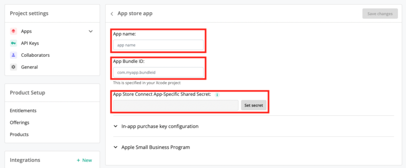 アプリ名やバンドルID、シークレットキーを入力しましょう。 シークレットキーの取得方法は下記をご参考ください。 https://docs.revenuecat.com/docs/itunesconnect-app-specific-shared-secret