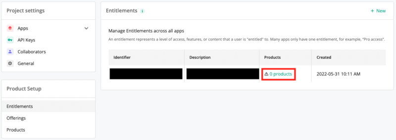 ⑥EntitlementへのProductの連携 Productを紐づけるため、「0 products」を押します。
