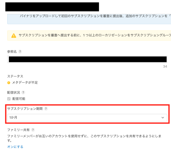 これで課金アイテムとしてサブスクリプションが作成されたかと思います。 ここからサブスクリプションの詳細設定を行っていきます。 まずは、サブスクリプションの期間を選択しましょう。(今回は月額制なので1か月)