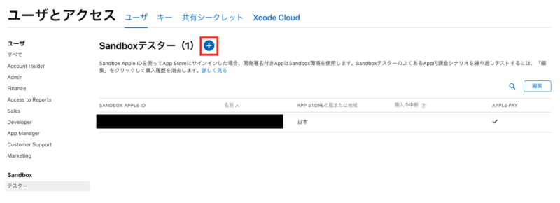 iOSではSandboxテスターにテスト用のAppleアカウントを追加します。 このテスト用アカウントに端末でログインすることで、請求なしの課金テストが可能になります。それでは「+」アイコンを押してください。
