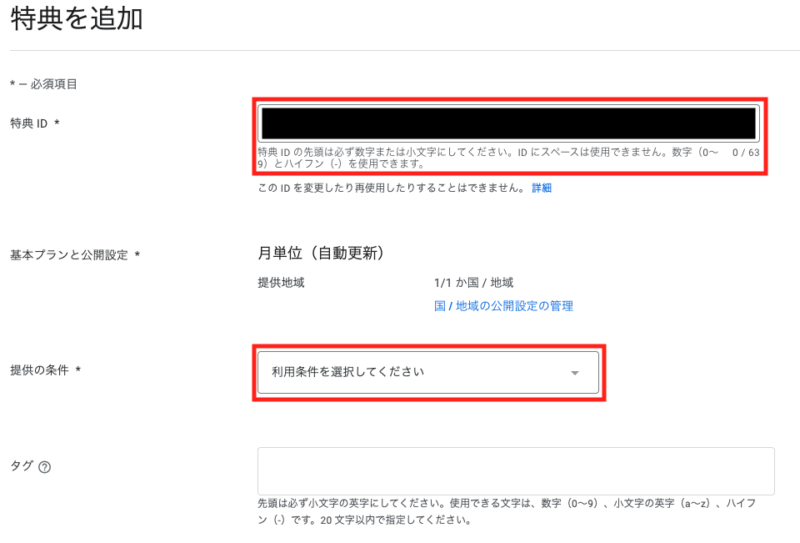 特典IDや提供条件などの情報を入力します。基本プランIDと同様、特典IDについても今回の開発で特に利用することはありません。