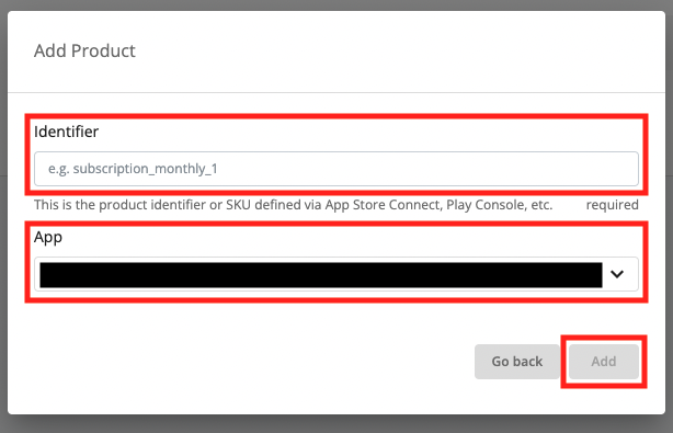 ストアで登録したID(iOSなら製品ID、AndroidならアイテムID)を入力し、ストアに登録済みのアプリを選択して紐づけます。「Add」を押したら完了です。