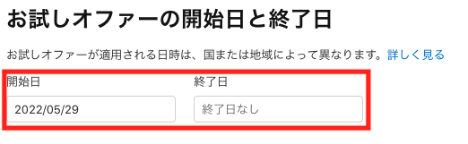 無料期間の開始日と終了日を入力します。 終了日をなしにすることで、永久的にお試しオファーを提供することもできるようですね。