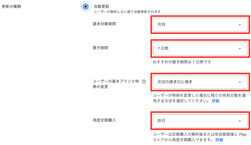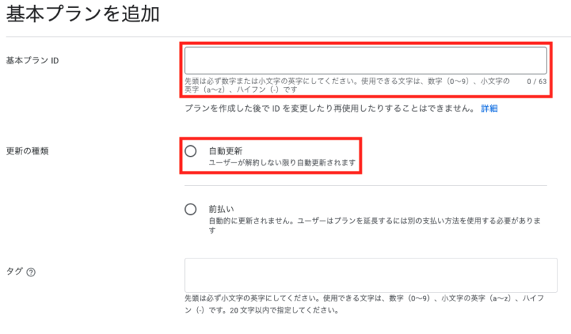 基本プラン作成に必要な情報を入力していきます。 RevenueCatでのサブスクリプション開発では、先に触れたアイテムIDのみを使います。このため基本プランIDはルール通りに入力していれば特になんでもOKです。 更新の種類は自動更新とします。タグについては空欄でもかまいません。