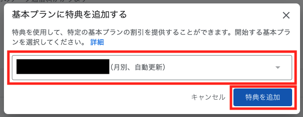 特典を紐づける基本プランを選択し、「特典を追加」を押します。