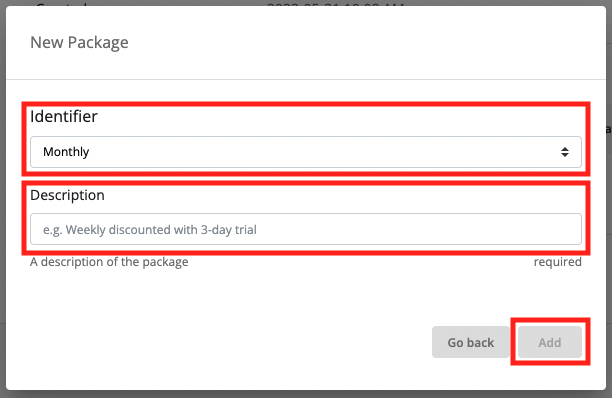 今回は月額課金のため「Monthly」を選択し、説明を入力します。「Add」を押したら完了です。