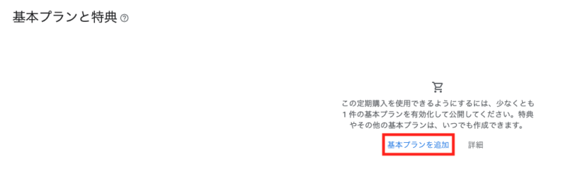 ここからサブスクリプションの詳細設定として、基本プランと特典(こちらはオプション)を作成します。 それではまずは基本プランから。「基本プランを追加」を押してください。