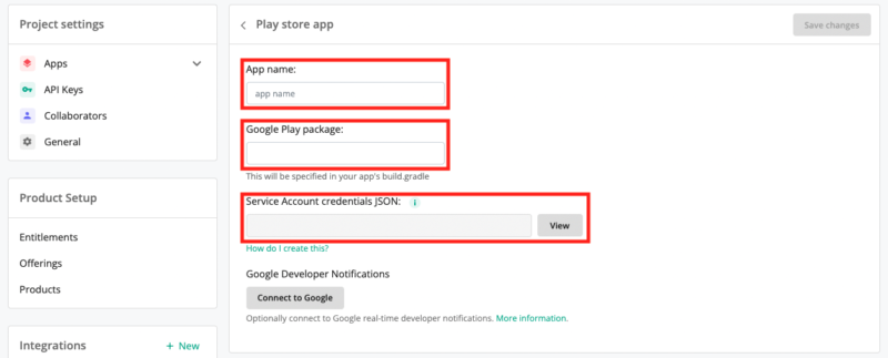 アプリ名やパッケージ名、JSONを入力しましょう。 JSONの取得方法は下記をご参考ください。ちなみにJSONはデベロッパーアカウント所有者権限でないと取得できないようです。 https://docs.revenuecat.com/docs/creating-play-service-credentials