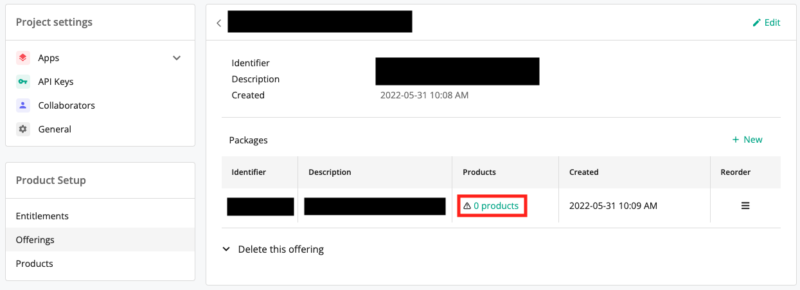 ⑤Offerings(Package群)へのProductの連携 Productを紐づけるため、「0 products」を押します。