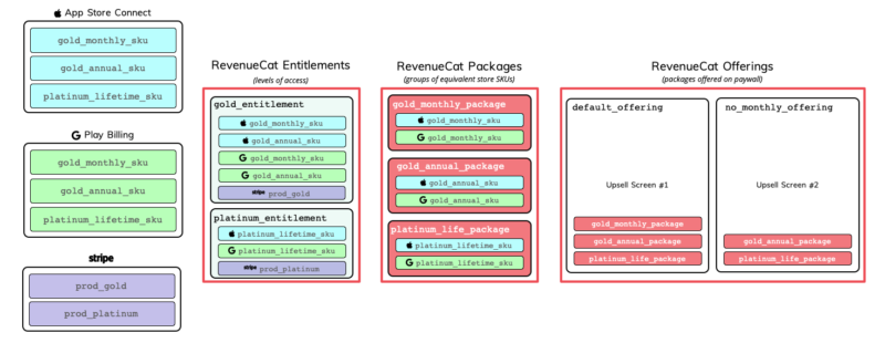 RevenueCatを利用するにあたり、押さえておいた方がいい課金アイテムの構成要素が4つあります。 あとでコーディングする上でも出てくる考え方のため、ここでご紹介します。 下記の公式ドキュメントも併せてご確認ください。 https://docs.revenuecat.com/docs/entitlements