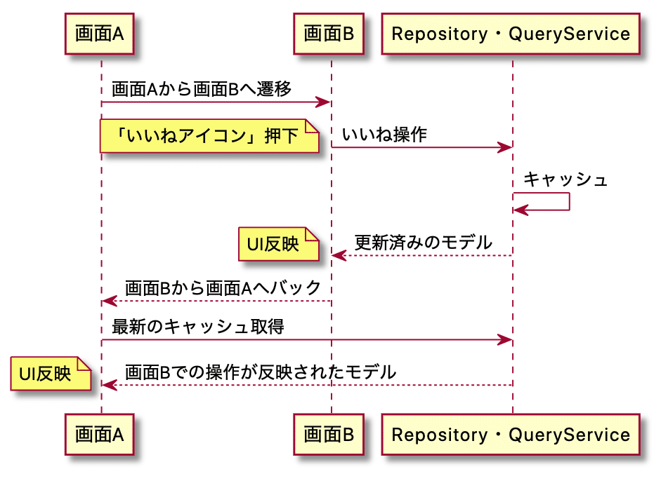 図にあるように、Repository (やQueryService) 経由でモデルを取得するようにし、画面遷移が発生したタイミングでRepository (やQueryService) のオンメモリキャッシュから最新のモデルを取り出し、UIを更新させるという流れになっています。 (※ 実際には画面から直接Repository・QueryServiceを操作するのではなく、ViewModelやBLoCを経由することになります。また、そこから直接RepositoryやQueryServiceを叩くのではなく、ApplicationService等を経由して取得することになると思います。)
