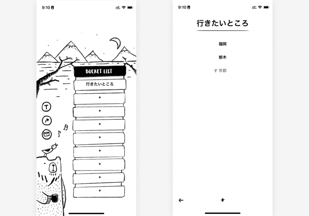 TODOリストは、よくアプリデザインの練習として挙げられることの多いテーマだと思いますが、このBBLは「機能は最低限に」という整理と、「このプロダクトならではのユニークさ」のバランスが良い印象でした。 アプリを起動すると、自動再生される鈴虫のような BGM。画面には、ゆるくて可愛いクマのイラスト。穏やかな気持ちでバケツリストが入力できるところが印象的でした!