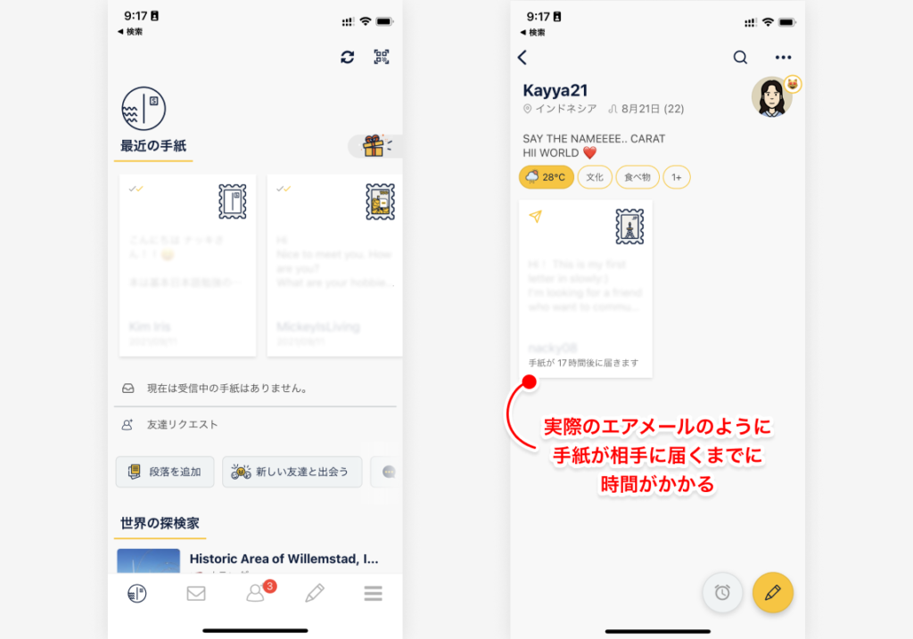 「世界中」と「手紙」というのがミソで、お互いに住んでいる国の距離に応じて、メッセージの受信までに時間がかかります。実際のエアメールを想起させられますね! データの送受信は瞬時にできるもの。しかし、敢えて閲覧に制限をかけることでプロダクトの独自性を強めているところが魅力的でした。