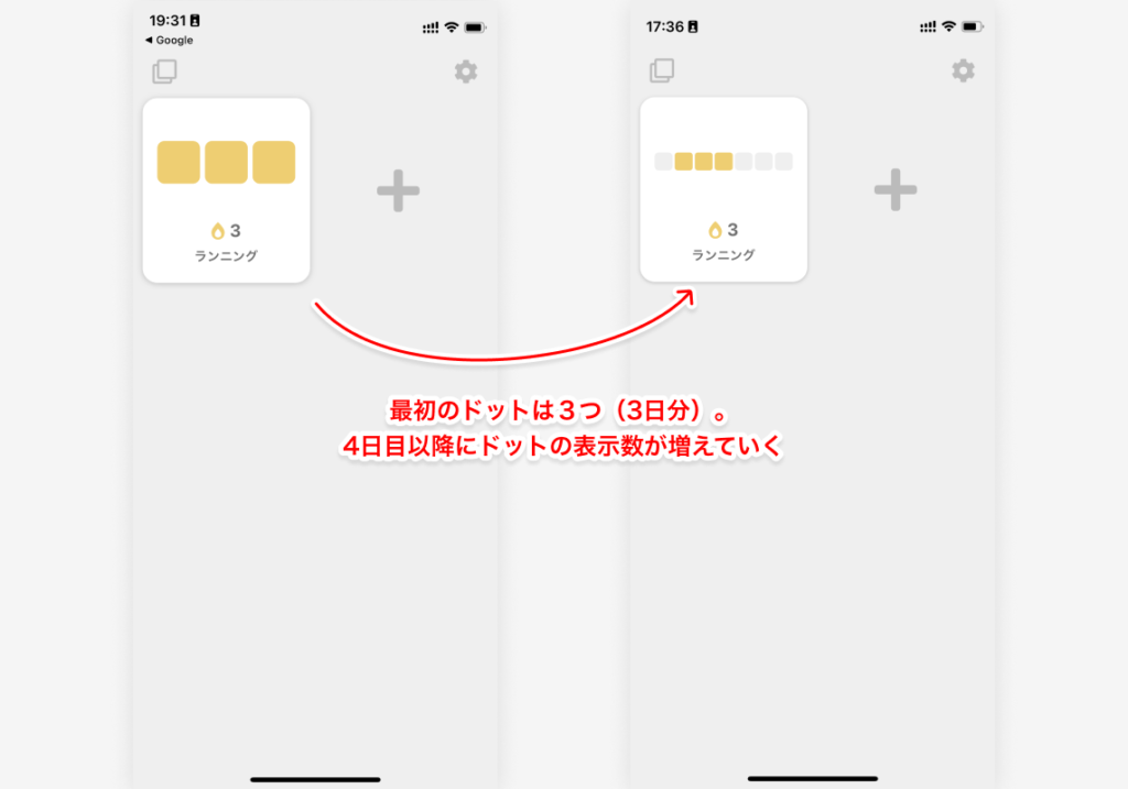 記録を残すと、ドットが塗りつぶされます。 印象的だったのは、最初のドットは3つ(3つ分)のみの表示で、日が経過するごとに表示されるドット数が増えるところ。 「3日坊主」というフレーズがありますが、最初から表示されるドット数が多く、「こんなに塗りつぶさないといけないのか…」と思ってしまうと、目標達成のハードルが高く感じてしまいますよね。 そこで「3つ塗りつぶす = まずは3日続ける」の成功体験を促すところが素敵だなと思いました! 機能はシンプルですが、ダークモード対応していたり、通知のメッセージをカスタマイズできたりと、細かいところもこだわっているところが印象的でした!
