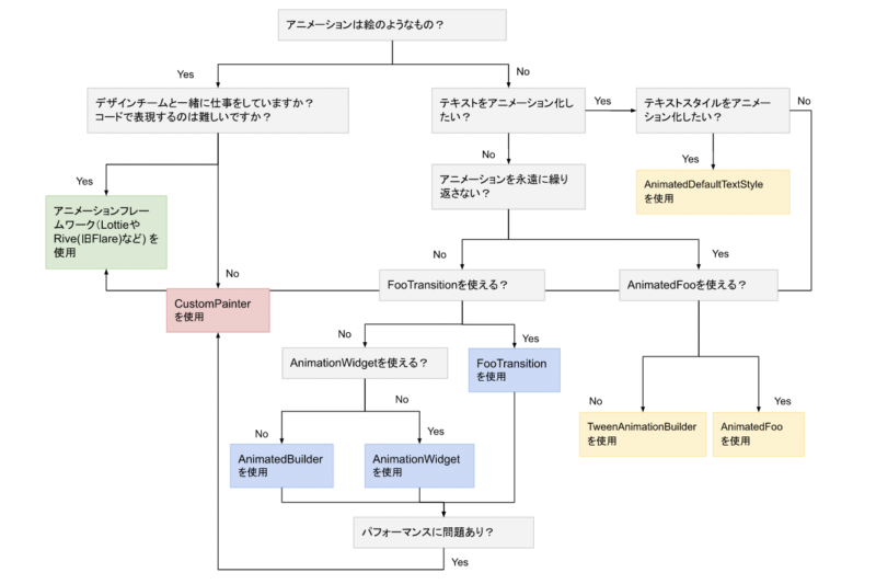 Flutter公式ページでディシジョンツリー(Decision Tree)が用意されているので、それを元に選択すると良いと思います。公式ページは英語で記載されているので、翻訳したものを掲載します。