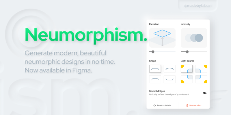 Neumorphismはニューモフィズムなボタンデザインなどを自動的に生成してくれるプラグインです。使用方法は、効果を加えたい図形を選択後に背景との距離や影の濃さ、光の当たり方などを調整するだけです。このプラグインやニューモフィズムについてはこちらの記事をご覧ください。