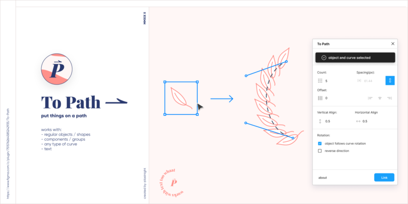 ToPathは図形やパスに沿ってテキストなどを配置することができるプラグインです。プラグインを起動し、2つのオブジェクトを選択後に位置を入力すると図形やパスにそってテキストを配置してくれます。Blobsで作った流線型シェイプとも相性がよく、組み合わせて使うことでよりアプリの世界観を作り出すことができます。