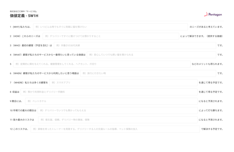 前提としてワイヤーフレームを作成する前に要件を整理する必要があります。ユーザーのゴールを明確にし、そのためにどのような機能が必要なのかを検討する必要があります。ユーザーゴールや要件が定まっていない状態でワイヤーフレームを作成すると、後から大掛かりな修正の恐れがありコストアップにつながってしまいます。Pentagonではユーザーゴールや仕様が固まっていない場合、こちらの価値定義シートで要件を整理してから作成を行なっております。