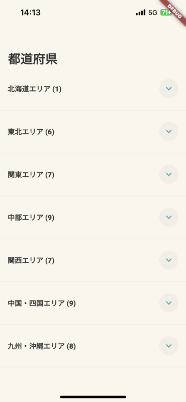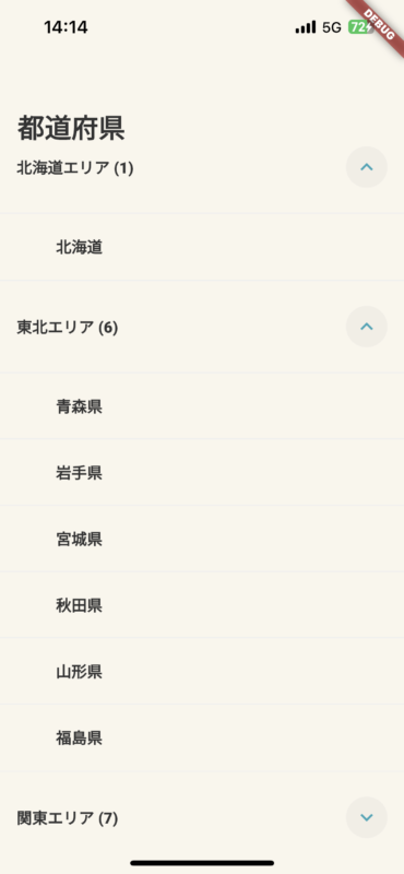 WidgetのareaCard内では今回のmainであるアコーディオンを実装しています。アコーディオンの実装にはexpansionTileを用いて実装しています。 expansionTile内のchildrenではエリアの中にある都道府県がprefecturesにリストで作成されているため配列mapを用いてprefectureがある間_listItemを表示するよう処理しています。 trailingにAnimatedRotationを用いてタイルを開いた時に動きを実装していますが、デフォルトで指定されているため特に色やicon、動きの変更がなければデフォルトでの実装をすることも可能です。