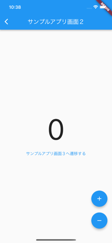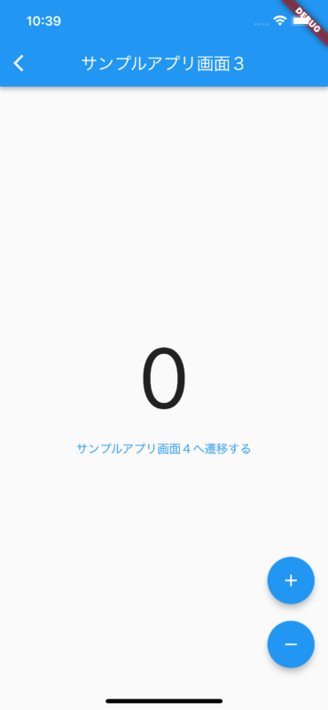このサンプルアプリ画面1では、右下の+ボタンをタップすることによって、useStateを使って保持した値を+1します。 また、右下のーボタンをタップすることによって、useStateを使って保持した値を-1します。 さらに、ボタンをタップするたびにコンソールにbuildが表示されます。