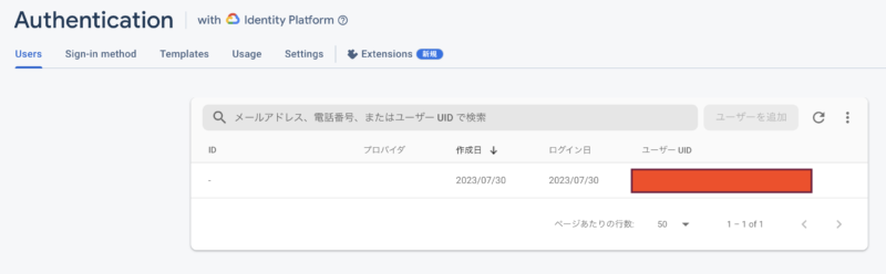 以上です。これら全てが終わったら実機で確認してみましょう。 Firebase認証をするとAuthenticationにユーザーUIDが登録されます。