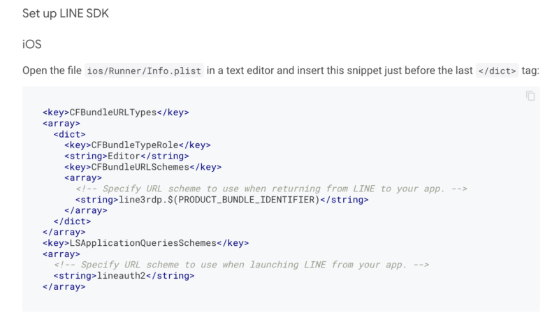 pub.devのサイトを参考に、ios/Runner/Info.plistの最後のタグの直前に追記してください。 https://pub.dev/packages/flutter_line_sdk