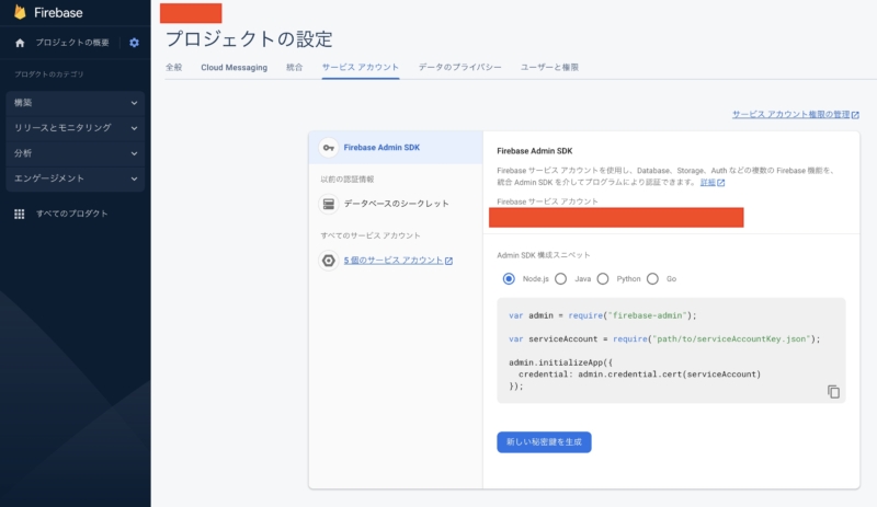 今回はjsonファイルの名前を「serviceAccountKey.json」に変更しました。 Firebaseコンソール画面での設定は以上です。