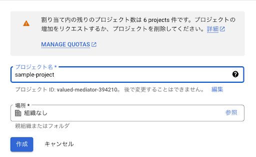 プロジェクトの作成画面に遷移するので、「プロジェクト名」に任意のプロジェクト名を入力して「作成」ボタンを押下してプロジェクトを作成してください。